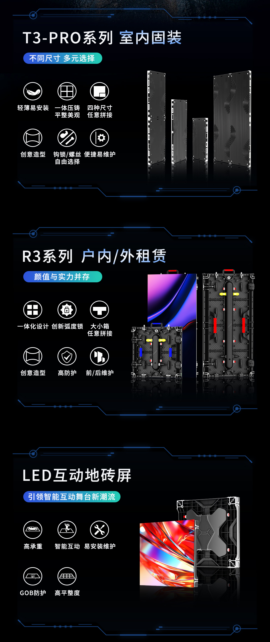 聯(lián)錦光電的創(chuàng)新力作 T3-PRO 系列室內(nèi)固裝顯示屏,支持四種尺寸隨心拼接,以百變?cè)煨挽`活應(yīng)對(duì)多樣化場(chǎng)景需求。R3 系列戶內(nèi)外租賃屏同樣造型豐富,輕松適配各類活動(dòng),其輕量化設(shè)計(jì)不僅便于搬運(yùn),還大幅削減運(yùn)輸成本與人力投入,為客戶呈獻(xiàn)高效、靈活且優(yōu)質(zhì)的顯示方案。此外,LED 互動(dòng)地磚屏、LED 廣告機(jī)等一系列產(chǎn)品,在優(yōu)化性能、降低成本的同時(shí),為客戶打造出更高效、環(huán)保、智能的解決方案,成功引領(lǐng)LED顯示行業(yè)技術(shù)潮流,推動(dòng)行業(yè)發(fā)展邁向新高度。