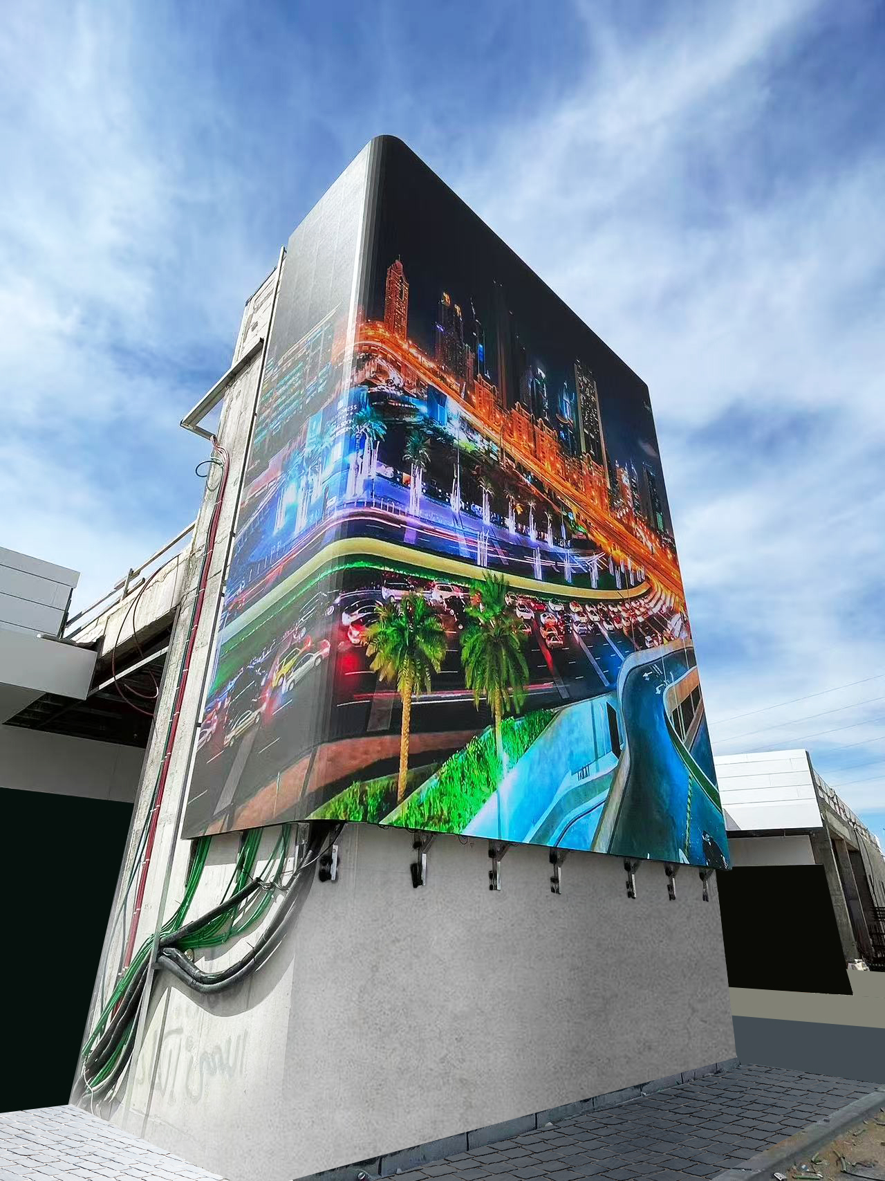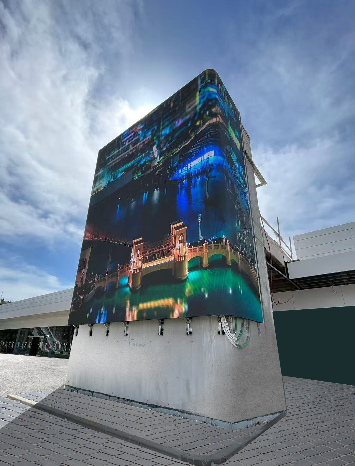 In order to perfectly integrate the LED screen with the wall, and fully consider the iconic value and environmental characteristics of this building, the Lianjin Optoelectronics team adopted innovative design: the left and right sides are installed closely to the wall, minimizing structural convexity and making the overall visual more slim and concise; Paired with smooth curved corners, it seamlessly blends with the modern architectural style of the Middle East, resembling a "digital art painting" embedded in the wall.