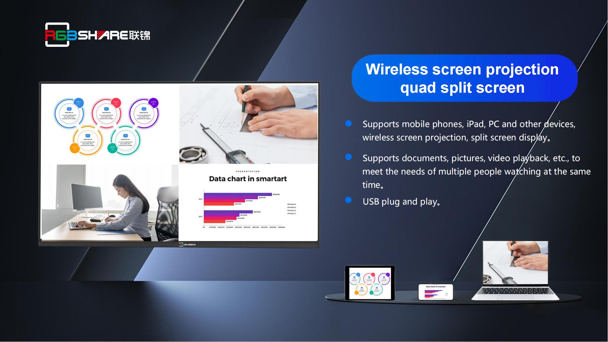 ?One click start, wireless screen projection, quarter screen;